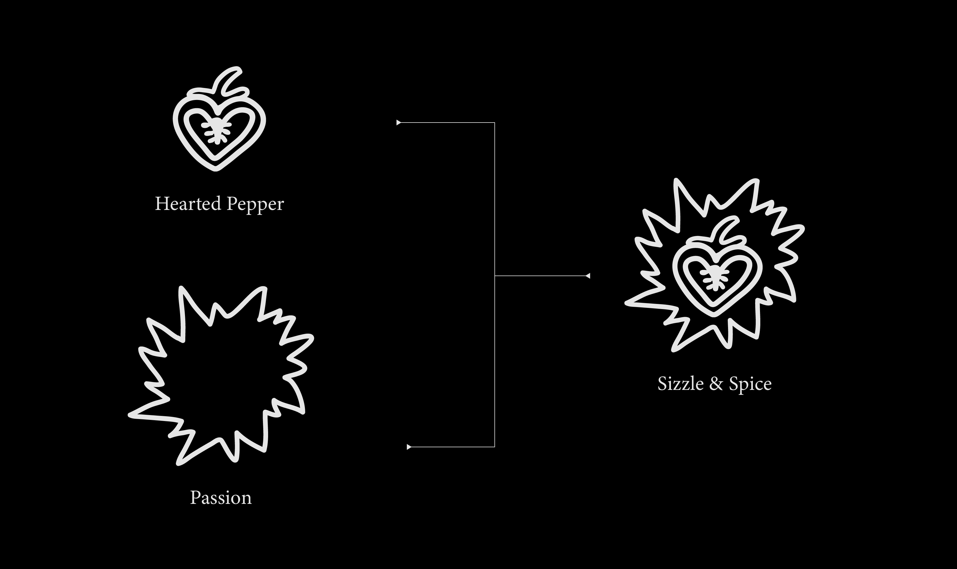 Sizzle & Spice's logo is a hand-drawn design inspired by its homemade quality, featuring a heart-shaped pepper surrounded by flames.