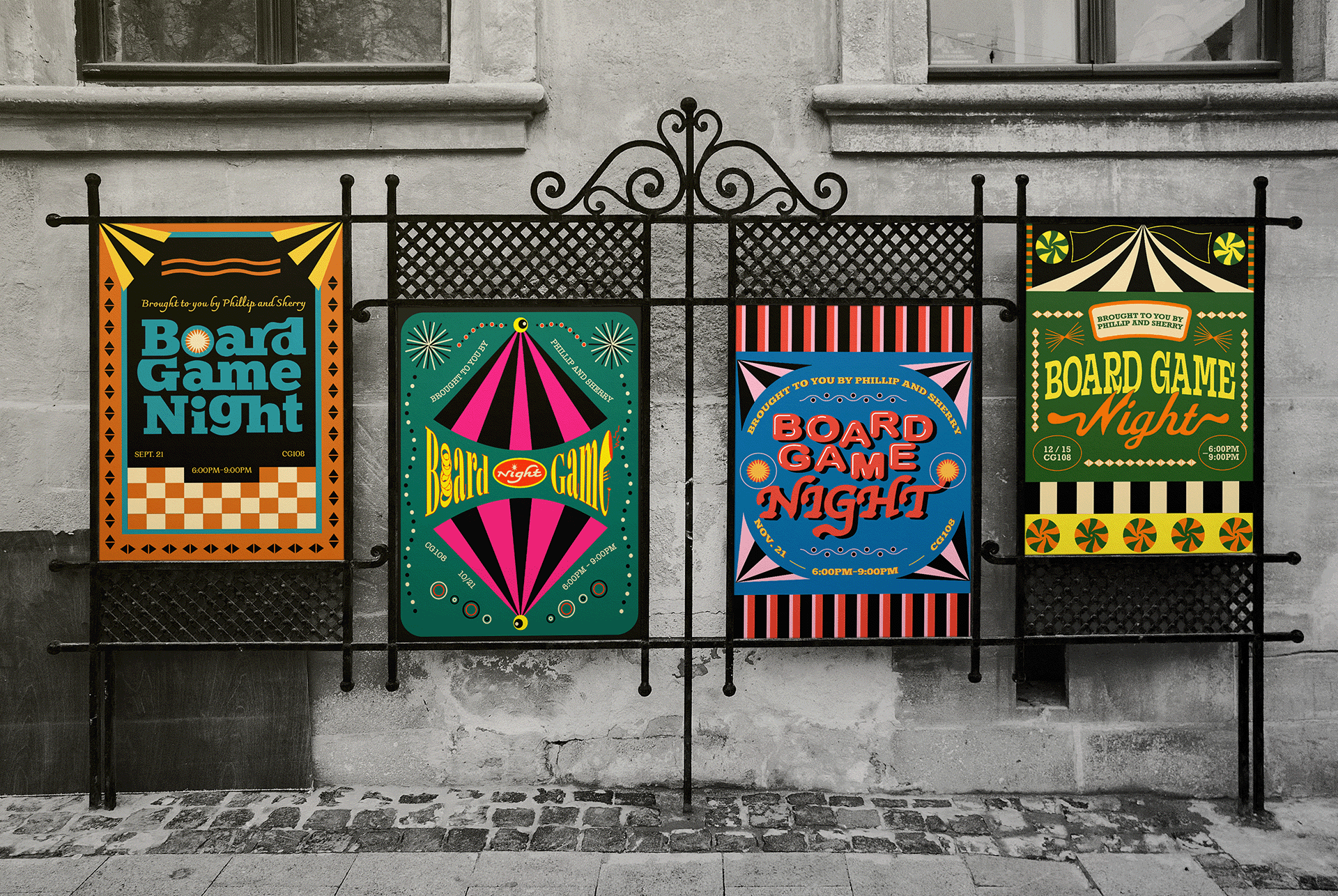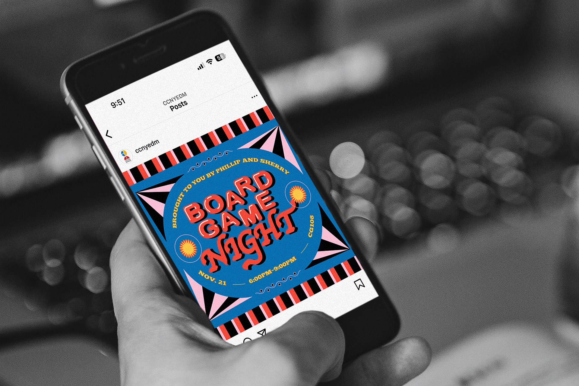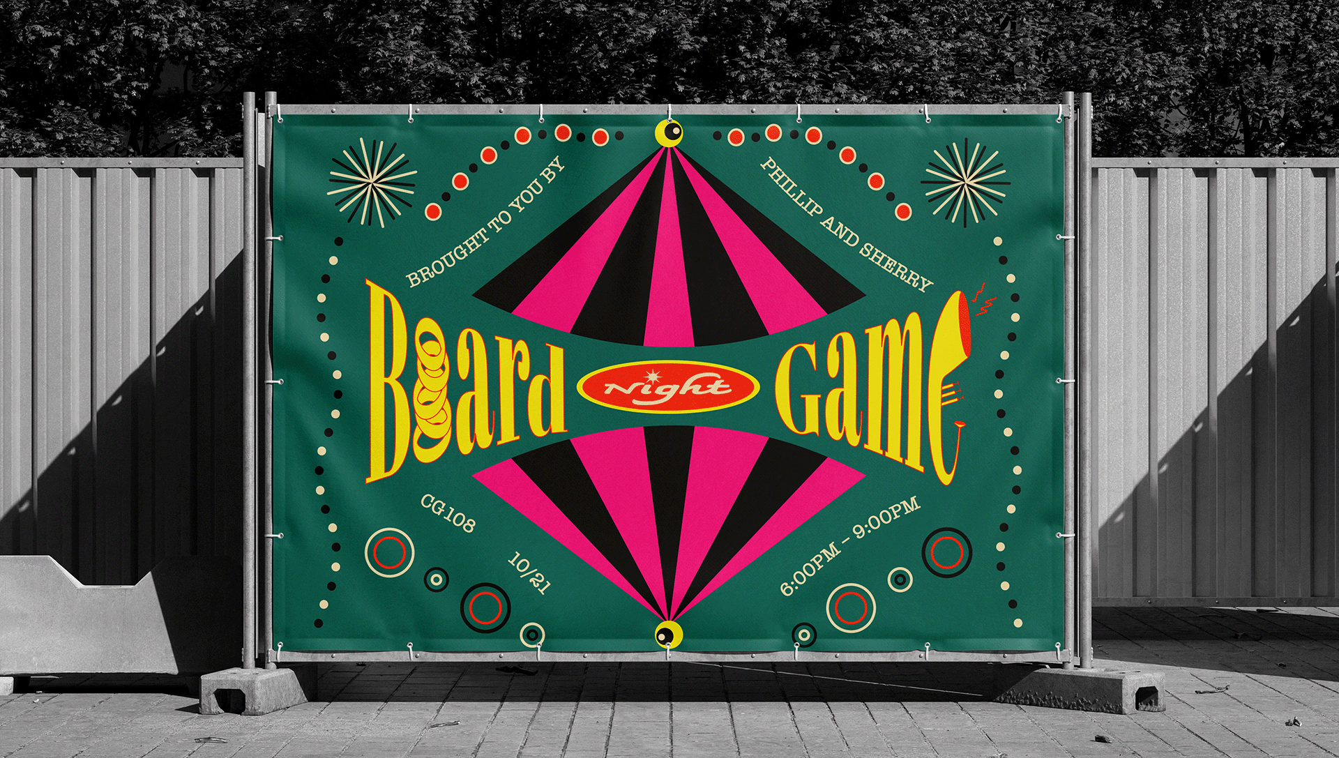 To promote the event with a lighthearted mood in the fall and winter, I utilized a carnival-inspired theme with a vibrant, saturated color palette and incorporated wore board game patterns to create an upbeat, cheerful vibe in the poster.